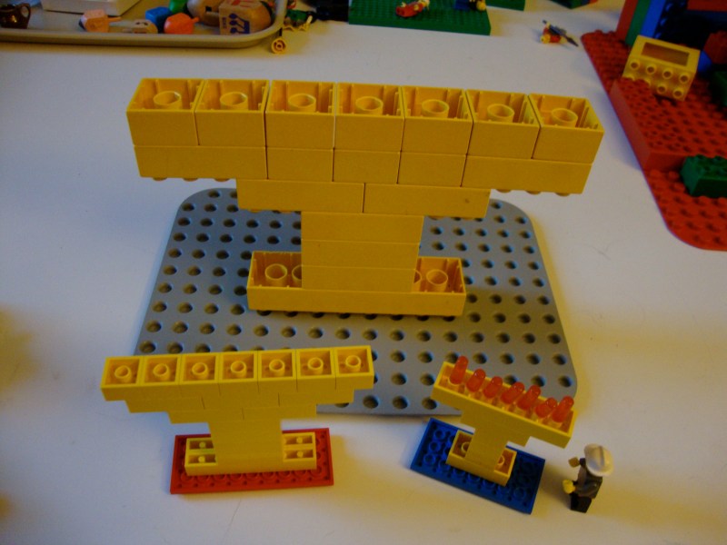 Duplo and Lego Temple menorahs, built upside-down