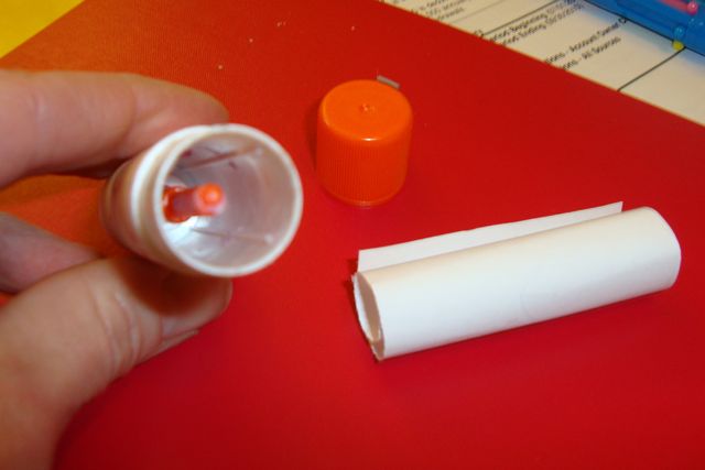 1. Twist until the end of the inner tube is as far out as it will go. Pull it straight out. It’s either got a teensy bit of glue left down in it, or it’s dried up from getting forgotten in the back of a drawer. Either way, it should pop right out. You are left with a hollow tube and a handy spindle.