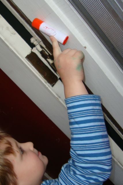 5. Mount it. We used double-sided foam tape. For rules about placement, see this brief and printable pdf from USCJ (from the Conservative movement). Technically, it goes on the right-hand side of a door as you enter it, and in the lower part of the top third. But this is glue-stick mezuzah made by a kid, so put it where your kid can actually see it and, more importantly, reach it. Tradition says we either touch it and kiss our finger, or vice-versa.