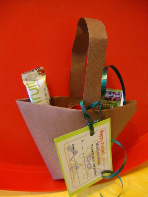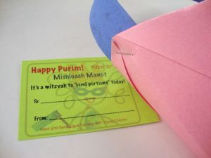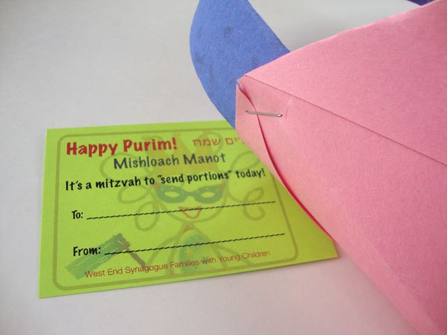 We made gift tags, too: Happy Purim in English and Hebrew, “Mishloach Manot: it’s a mitzvah to send portions,” and space to write To and From.