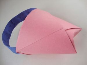 Remember the origami paper cup pattern? It’s pretty common in schools and scouts and whatnot. This is it, plus a stapled handle. (The cup can actually hold water, as long as you don’t need it to hold water for very long…)