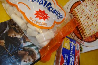 1) Apply toasted marshmallow to a piece of matzah spread with K for P chocolate chips, top with similar-sized piece of matzah and by the time it’s cool enough to eat the chips will have morphed into a pleasant smooshiness.