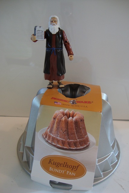 SLOW: More in keeping with slow-food “kitchen Judaism” will be the jumbo-size Mt. Sinai pictured at left. My mother-in-law kindly bought this kugelhopf bundt pan just so I could have a suitable platform for my biggest Moses action figure (I own several). It’s going to be a gluten-free chocolate Mt. Sinai, but theoretically I could make a fruit cake using all of the Shevat ha-Minim: the Seven Species of Shavuot. Wheat, barley, grapes (raisins), figs, pomegranate, dates and olive oil would make a tasty, healthy and Deuteronomy 8:8-approved cake.