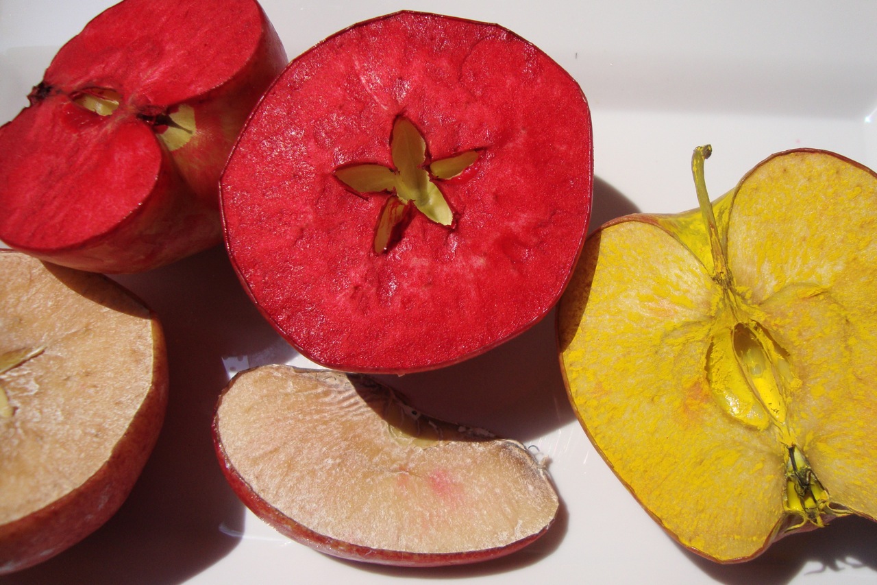3. Cut the apples in half from top to bottom and in quarters. Cut half horizontally around the equator and ask what your child sees in the middle.* Try to make flat, smooth pieces that will stamp evenly.