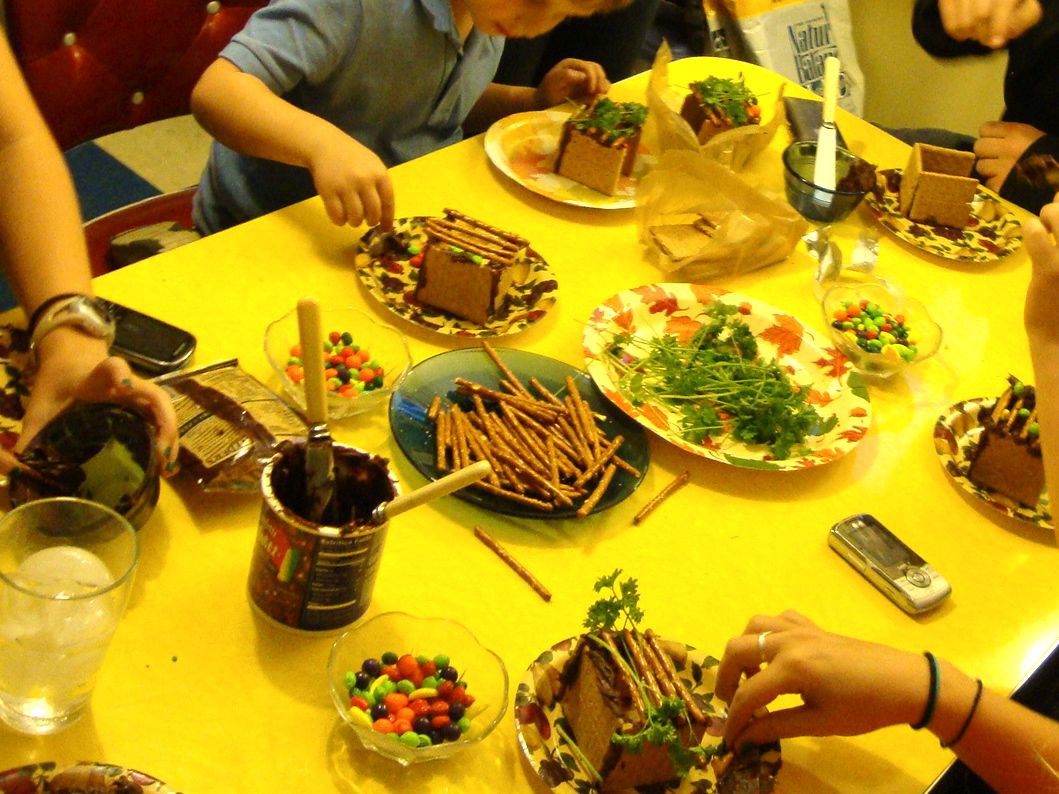I already detailed—and I mean detailed—how to plan for and facilitate an edible sukkah event at a synagogue on the actual holiday. I felt compelled to share those tips because I worked so hard to successfully navigate the various challenges. The building kept strictly kosher; the event was on a holiday with work restrictions (no snipping corners off of ziploc bags to apply frosting, no writing names onto a child’s paper plate, etc.); I wanted genuinely attractive results that mimicked real sukkah construction; and I wanted to create kits so that every child had his own materials at hand. I’d had enough chaos at these events in years past, when eager hands demolished bags of hastily bought groceries. Panic would ensue among the higher-strung, greed would erupt among the rowdy, and the children who did not feel comfortable diving in and laying claim to unbroken pretzel sticks would get left out completely. My meticulously prepared kits created order and did not diminish enthusiasm one whit. Enthusiasm was somewhat dampened by the fact that I underestimated the number of kits required, but plenty of boxes and packages were on hand. I keep them around anyway, so that parents of kids with food allergies can look at ingredients.