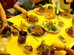 Fruit decor: I like my edible sukkah decor to look realistic. This led to an exhaustive search for to-scale, fruit-shaped gummies and candy as outlined in my earlier post. I did finally find a manufacturer of kosher, fruit-shaped hard candy called Nitwits. Yes, they look as cute as the nonkosher Runts hanging from the pretzel stick roof of an edible sukkah. But here is what I realized this year: they are too heavy. Even big kids have trouble making heavy, slick candy shapes stick to the underside of a pretzel roof. And, they do not taste great. I’m not a fan of hard candy, period, but the mixed-age group that made edible sukkot at my kitchen table this year all agreed that the adorable candy tasted yick.