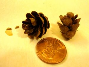 Our Playmobil model is shown holding a hemlock cone with a soy-butter shmear and a coating of millet. This hemlock, by the way, is not the poisonous herbaceous plant that clocked poor Socrates, but the lovely and benign conifer tree. Hemlocks also come in handy for decorating tabletop sukkot: the leaflets look like mini pine boughs for schach.