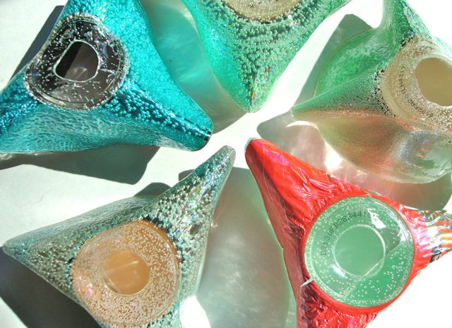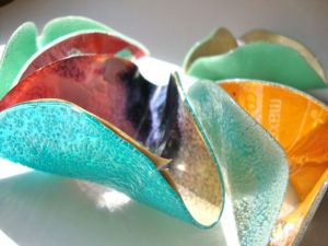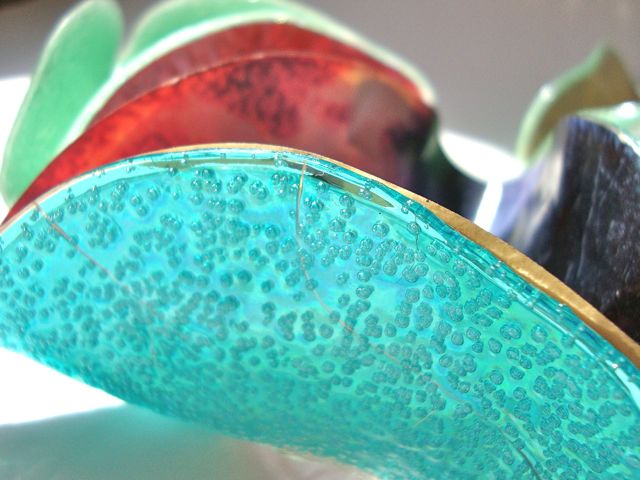My bowls did do interesting things when in the fiery, fiery furnace. Solid colors became bubbly, translucent pastels. When the discs slowly surrendered to the heat, they draped themselves over whatever was beneath them and stayed there. I put them atop various forms, hoping for total control: wads of aluminum foil, jar lids, upturned custard cups, etc. Maybe, just maybe if I’d had silicone gloves I could have held the stupid, hot things long enough to cool into appropriate shapes in my very hands. But they are just too small to fool with, really. See the picture with the kisses? They’d barely hold a normal size hamantasch.