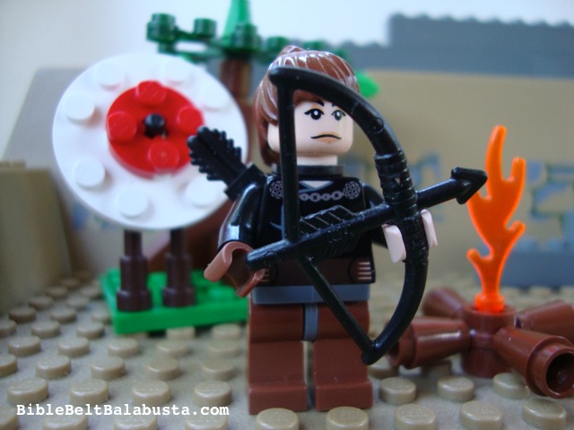 We’ve already been fiddling with the LEGO. For this year’s Passover seder afikomen treasure hunt—always an elaborate affair—one of the guests was a Hunger Games fan. I hid her clue in a minifig rigged to look like Katniss with bow and arrow. After the seder, I put Katniss in storage for a Lag B’Omer vignette. What with Real Life and all, I nearly forgot. But lo, this morning, I read Marjorie Ingall’s Tablet article about Lag B’Omer and Katniss and feminism and the potentially transformative powers of a bow and arrow. Suddenly, my minifig and her Lag B’Omer bow and arrow needed to surface, to join the virtual cache as one more girl-power image. So, here she is, above, and with a traditional holiday bonfire.