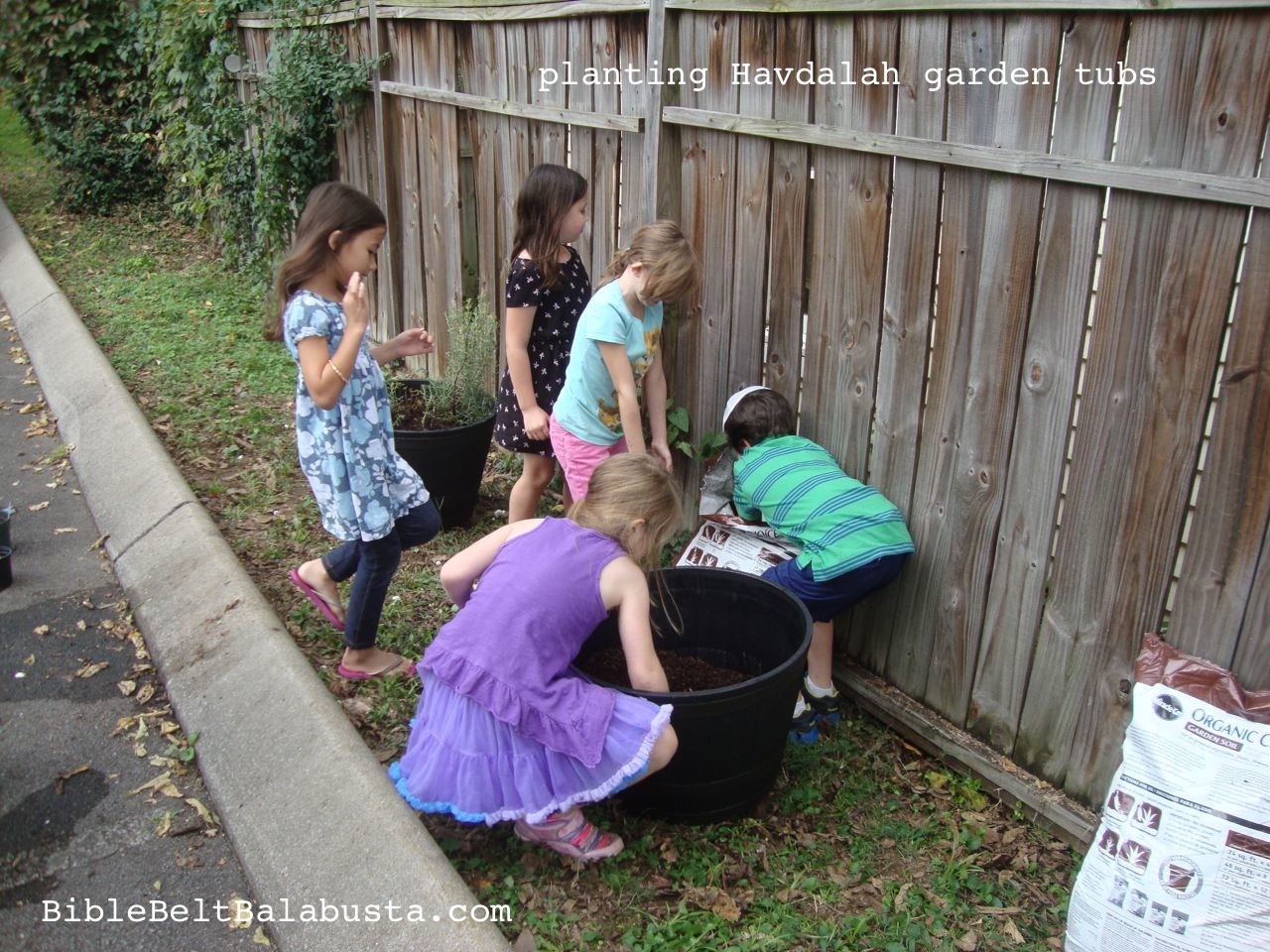 •Art: Students can craft signs for each plant in English and Hebrew, and a sign for the tub itself. We’re naming our tubs Gan Mitzvot (garden of mitzvot) because we plan to enlarge the scope of planting beyond Havdalah. Parsley and Horseradish, for example, for Passover. (Horseradish must have its own container! See my post about repurposing leftover Maror after the seder.)