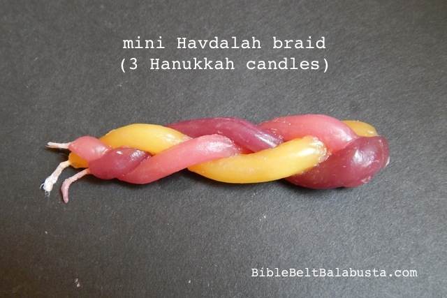 2) Smart teachers at Temple Beth El (Austin, TX) figured the Hanukkah-candles/Havdalah-candle-thing all on their own. Here’s the link wherein they share their trials and successes (and in-progress photos). Note the neat touch of adding drips of wax from a lit candle: the drips add color and help fuse the twists/braids.