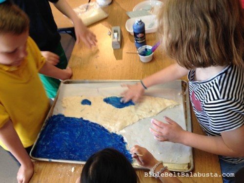 Neighboring countries are dough the kids dyed in bowls before pressing into place. This is in contrast to the blue bodies of water, which we did not dye beforehand. We created the depressions for the Dead Sea, Kinneret and Mediterranean Sea and then brushed each one with blue tempera paint. Why? I wanted to keep all water blue and to paint them directly to make them more memorable as geographic anchors. Note we forgot the Jordan River. Next time…
