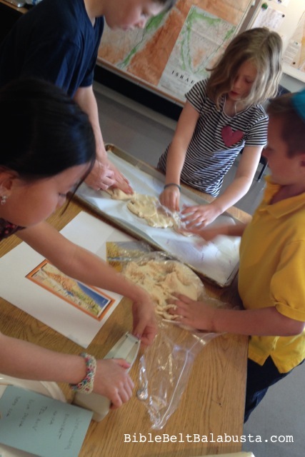 Salt Dough: My co-teacher Erin mixed the dough at home and brought it in ziploc bags, because we knew we wouldn’t have time to let the kids make it. Ideally, you’ll have time. Salt dough is a forgiving recipe, so even a toddler can’t mess it up. The only trick is to add a smidge of water at a time, so you don’t end up with sloppity gloop. Or gloopity slop.