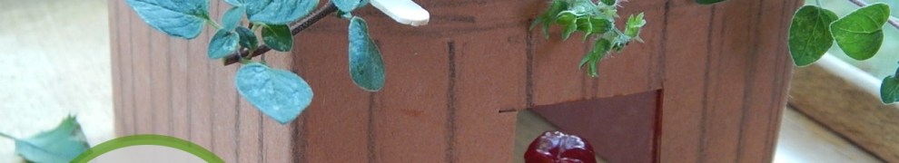 Add some wooden coffee stirrers for the roof supports, and teeny branches for schach (Eastern hemlock twigs are ideal, but I used thyme and other little herbs)