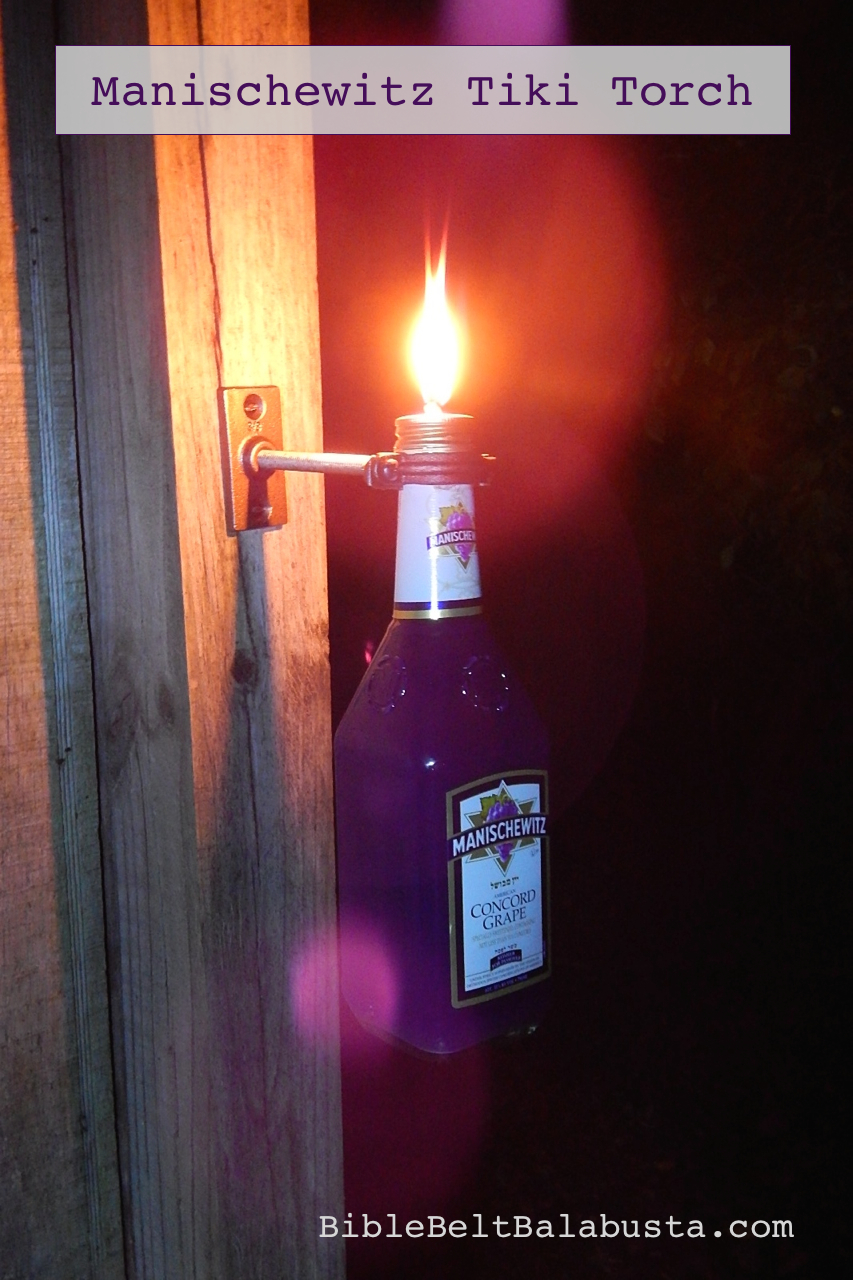 This is not a tutorial. This is not a DIY project at all, in fact, because I do not wish to be sued when your Manischewitz Tiki Torch slips loose and plummets to your power-washed deck like a molotov cocktail. Nor do I wish to be held liable when your sister-in-law’s up-do ignites as she sidles by. This is is an open flame in a heavy bottle held by an ill-fitting clamp on the end of a rod.
