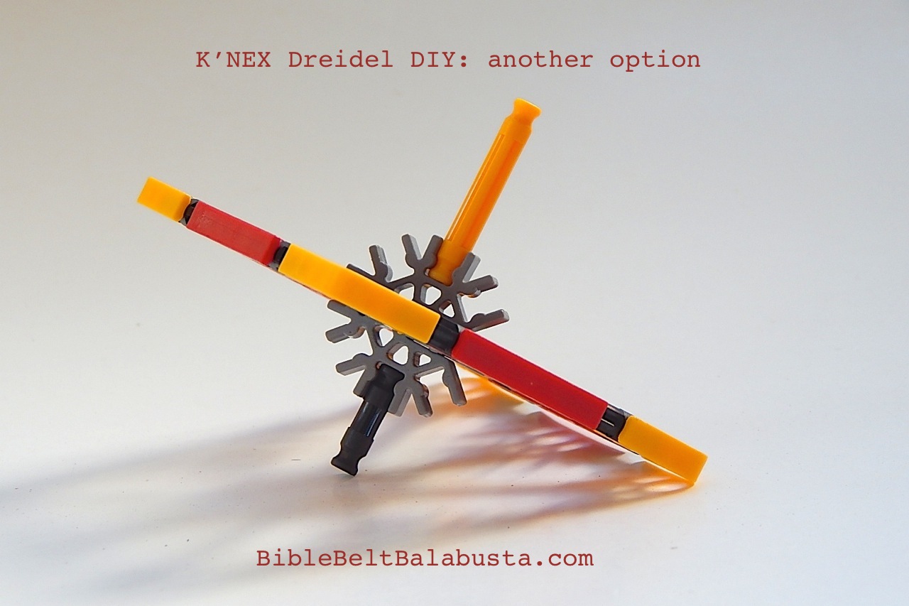 I don’t see anything about a DIY K’NEX dreidel online, but there are a few “tops” here and there. So, to remedy another Internet oversight, here’s my simple K’NEX Dreidel: just a four-sided top with kavanah / intention. Even young kids can put it together just by looking at the photo below. I hope it will inspire builders to come up with different models, testing for balance, stability, speed, endurance and whatnot.