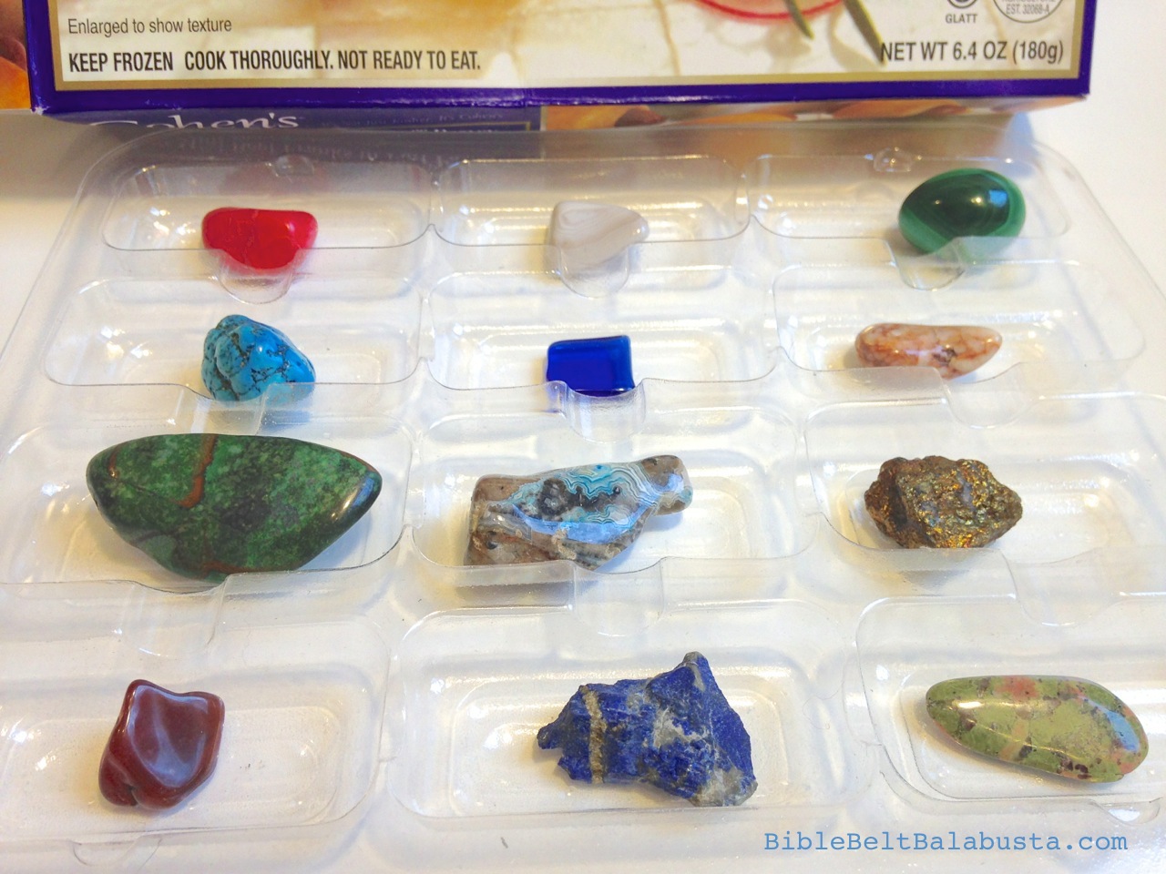 Wondering which stones we need? Note that the two Exodus descriptions (28:17-12 and 39:10-13) agree as to exact stones within a single translation—I use JPS—but different translations posit different stones. For example, a page of parallel translations lists the first stone as a carnelian, ruby, red quartz, or various forms of sardius, whatever that is. It’s a mess, actually. But, an educational mess. The complexities of identifying the gems could be an early lesson in biblical exegesis—just a heads-up that interpretation exists—even for PreK. I’m serious.