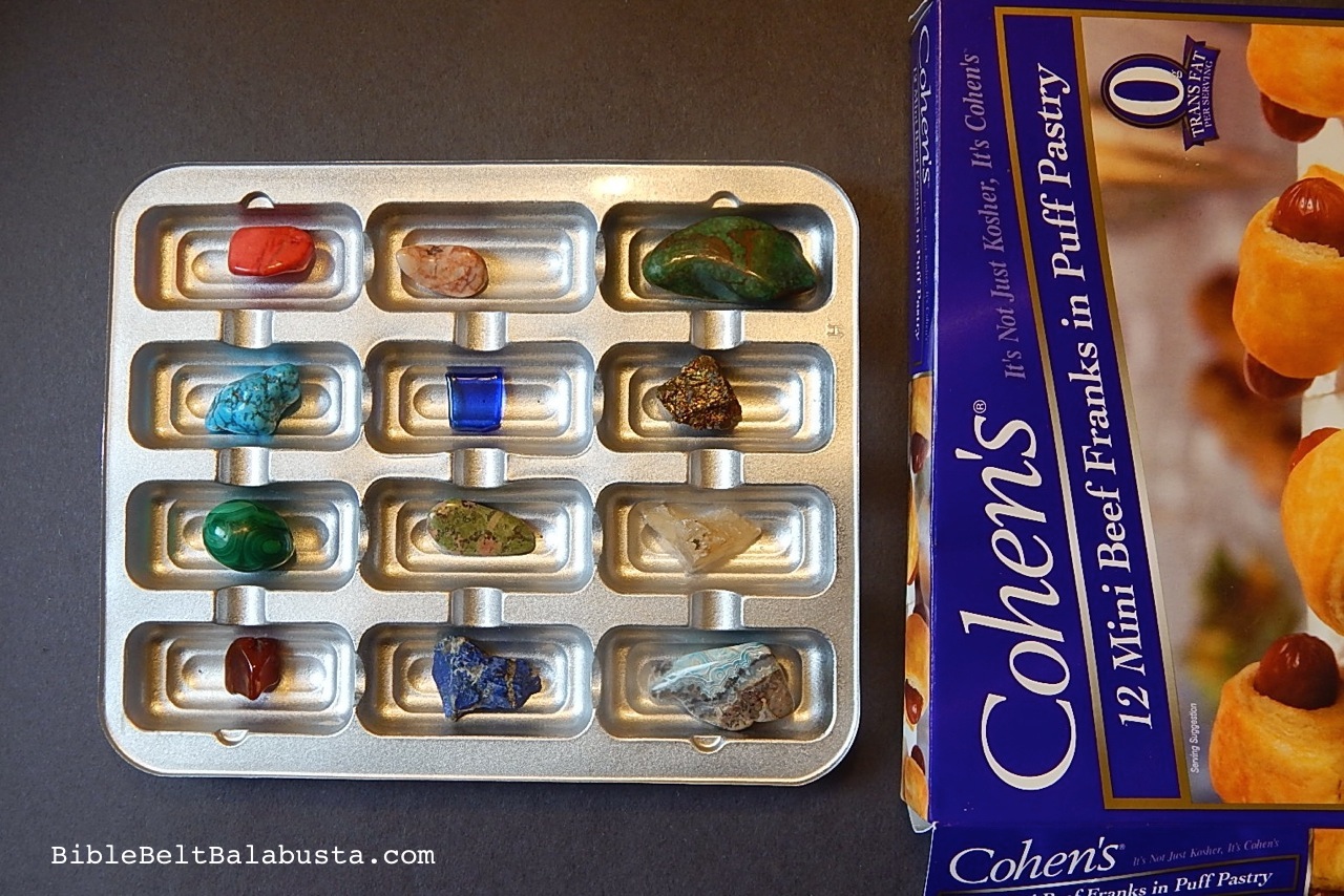 Meanwhile, in Exodus 28, God orders Moses to fashion the high priest’s breastplate as a grid of four rows of three cavities, each designed to cradle a semi-precious stone. It is but an easy step to convert our tray o’ franks to a tray o’ gems: just remove a weenie and insert a ruby.*