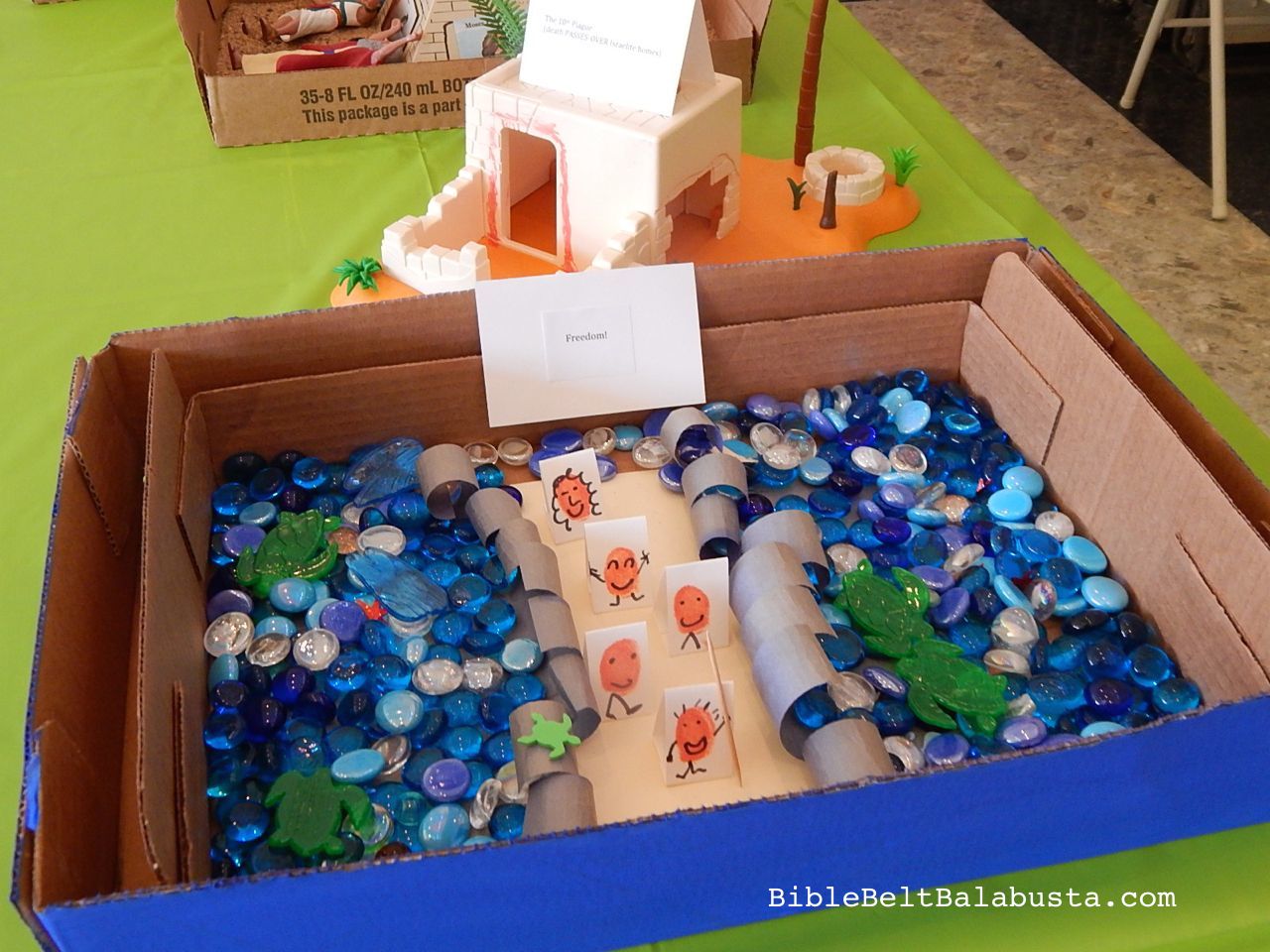 The Sea of Reeds is by a 1st grader (using my 30 min. thumbprint people diorama lesson), and the rest are by 2nd graders. I ended up making Slavery, because we ran out of time. Note the LEGO Israelites are building a store city, not a pyramid…