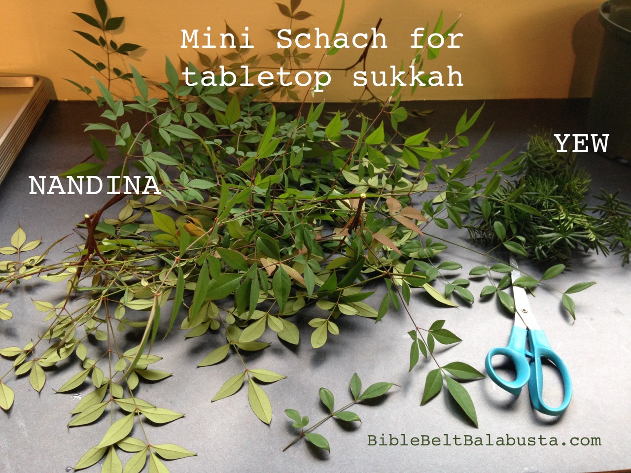 Schach: Real “branches” are best because it’s what we use on a really real sukkah. The rule is to use a once-living material that is no longer connected to the ground. The cutest mini schach is from Eastern Hemlock twigs (the mini cones are fabulous). Also cute are short twigs of Yew shrubs and the tiny new growth on Nandina (Heavenly Bamboo). All of these green things match the scale of our LEGO sukkahs. The kids love selecting branches and placing them just so.