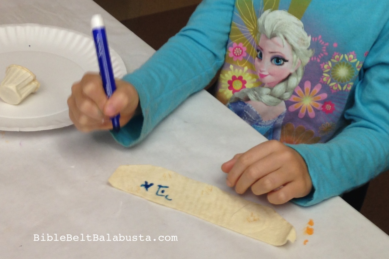 and then students wrote with a food-safe marker on their parchment. Depending on the class, they wrote the letter they’d just learned (we had lots of gimmels), or their Hebrew name, or the name of the holiday, or just random letters from an aleph bet chart in the room.