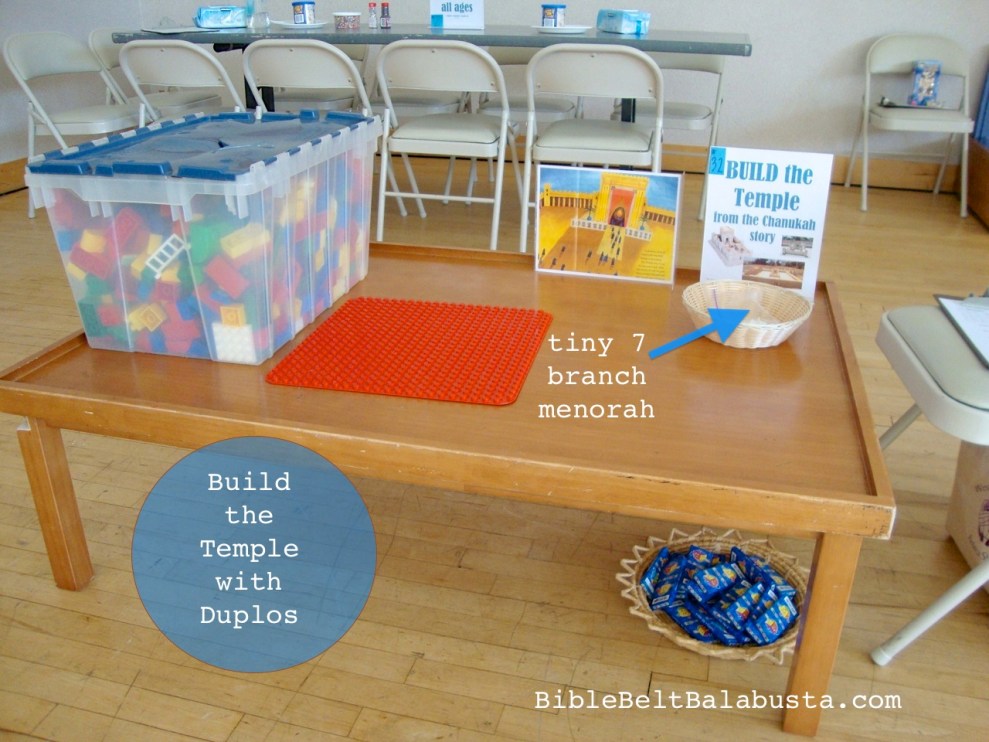 • Build the Temple with Duplos: Ideally, a train table (low, with sides to contain bricks) filled with Duplos. Post a picture book illustration of the Temple from a Hanukkah story, and keep book at station (because you might end up reading the story aloud, which is awesome). This is an excuse for relaxed, free-build and will attract little builders who might be overwhelmed with other types of stations. Ideally, add a tiny metal menorah (7 branched as per story) to build around.