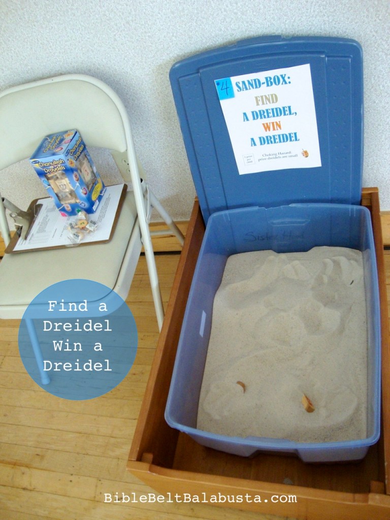 • Sand Pit Dreidels: Fill a 66 qt. plastic bin (or bigger) with Play Sand. Bury big dreidels. Keep track of how many are buried. Offer prize if player finds one or all. The beauty part of a plastic bin is that it has a lid and can be easily stored for next year.