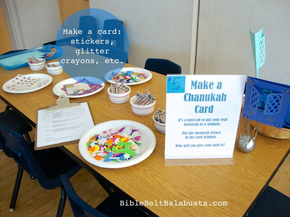 • Make a Hanukkah Card: provide stickers, crayons, markers, rubber stamps, paper and examples of how to spell Hanukkah in English and Hebrew.