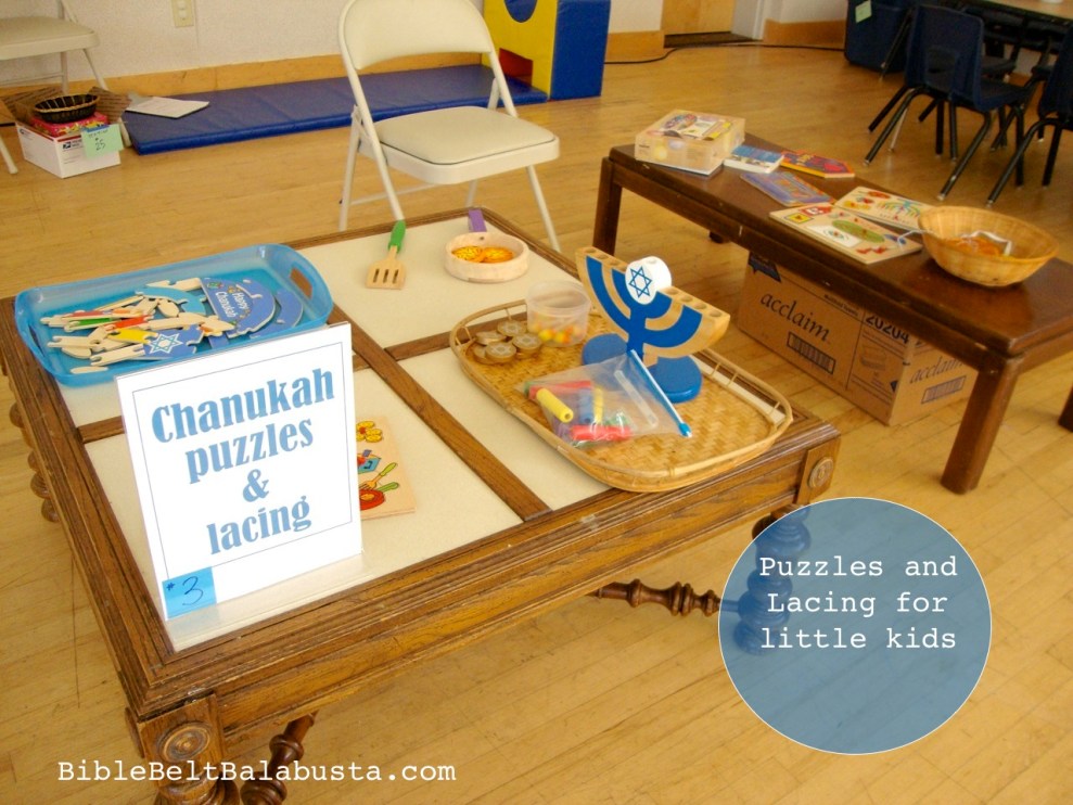 • Puzzle & Lacing Area: Wooden Hanukkah puzzles, KidKraft Hanukkah play set (this is gorgeous, have you seen it?), Hanukkah Lacing Boards with thick shoestrings. Put each on a tray to define space and keep orderly. No one wants to play with a puzzle scattered all over the floor.