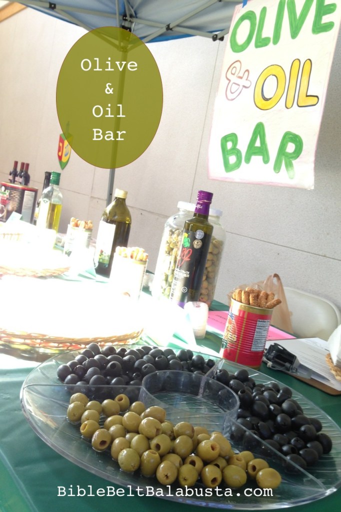 - Olive and Oil-tasting bar. Video of olive grove / crusher in Israel on DVD while folks eat.
