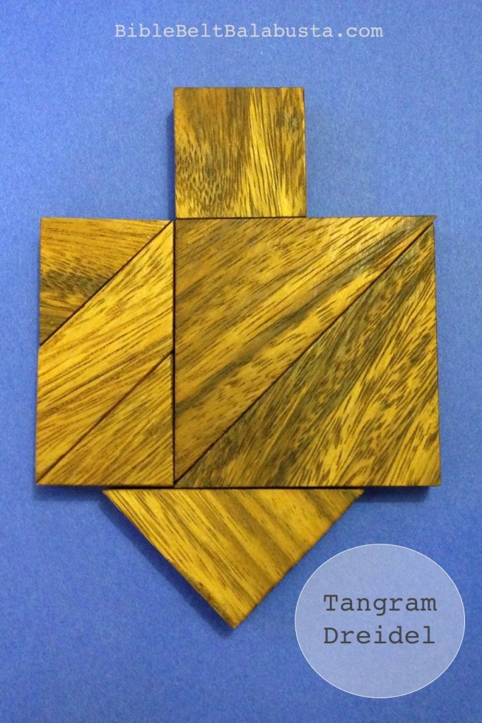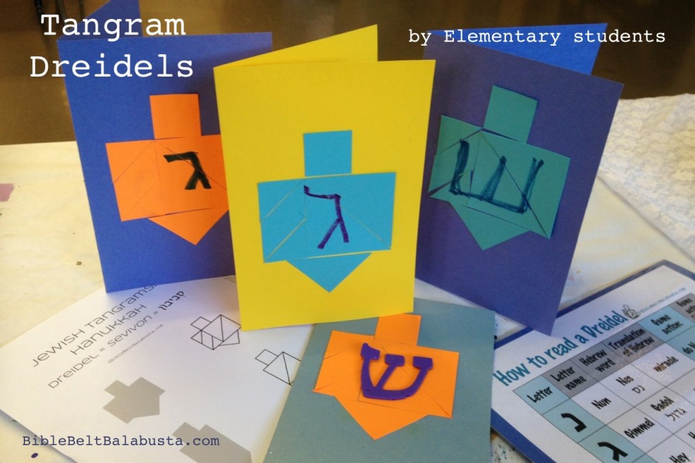 • Tangram Dreidels (puzzle station or art station, you choose): print my Tangram Dreidel template and provide touch-me tangrams (see tips on making free sets at my Jewish Tangram Page). Kids can solve the puzzle and go, or they can glue paper tans to a larger sheet and create “art” to take home (provide glue sticks, markers and my Dreidel Letter chart.)