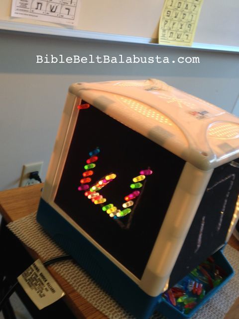 And, we are lucky to have some Alef Bet blocks, too. We have two sorts: the small, cheap kind and the big, expensive kind. I love both. The small, cheap kind (around 5 bucks) are the same size as our aged alphabet blocks—about an inch and a quarter—good for teetery towers and for crafty projects like, say, a Hanukkah menorah using blocks that spell out your kid’s Hebrew name.