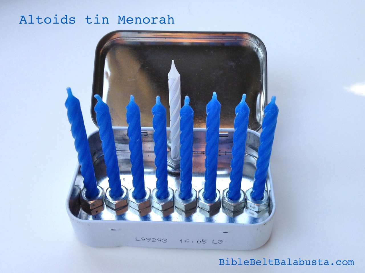 Nine hexnuts glued inside an empty Altoids tin = Travel Menorah.  Or, a Curiously Tiny Menorah.  You can’t get much easier.  Or smaller for that matter. (EDIT: see smaller one here.)  Mine is the classic Altoids size, and it holds—just barely—a row of birthday candles with the Shammash nearby.